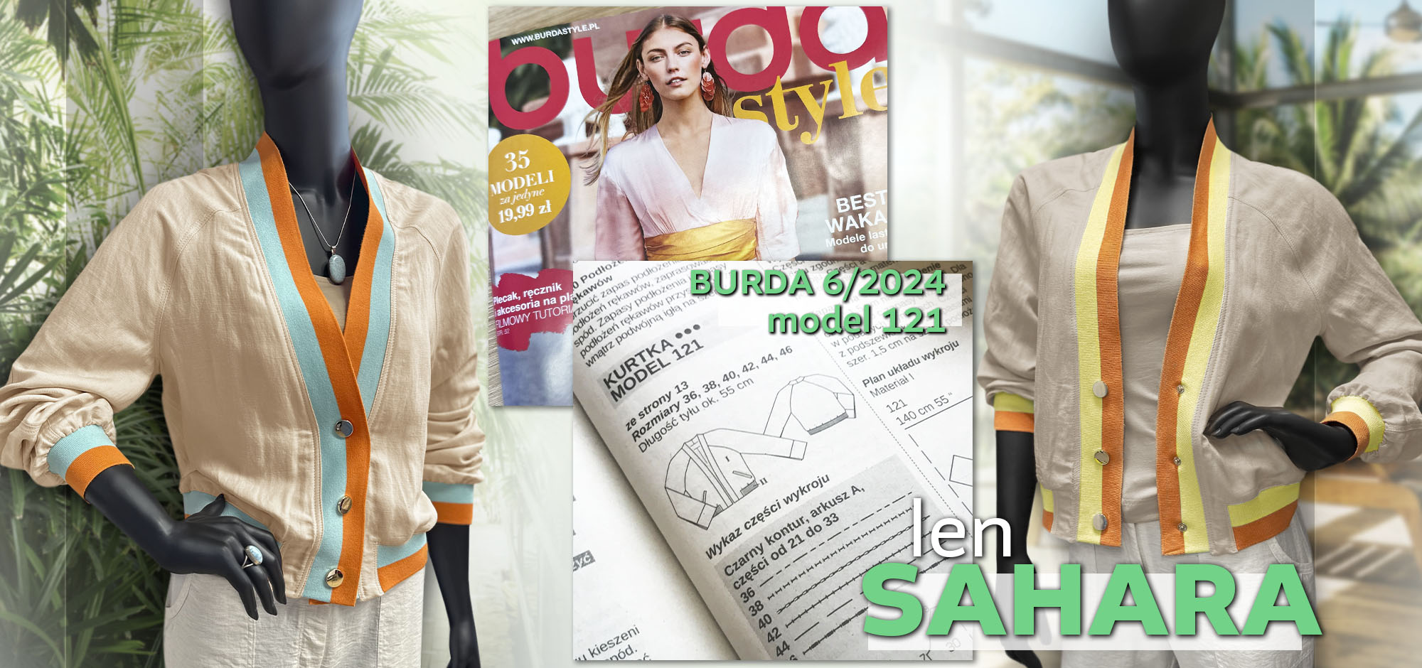 Len Sahara to naturalna tkanina wykonana z połączonych ze sobą włókien lnu oraz wiskozy. Posiada unikatową fakturę, w której diagonalny splot łączy się z charakterytycznymi dla tkanin lnianych grubszymi nitkami. Tkanina jest bardzo przyjemna w chwycie, miękka, układa się lejąco. To świetna propozycja nie tylko na sukienki i bluzki, lecz także na lekkie okrycia wierzchnie, np. bomberki.